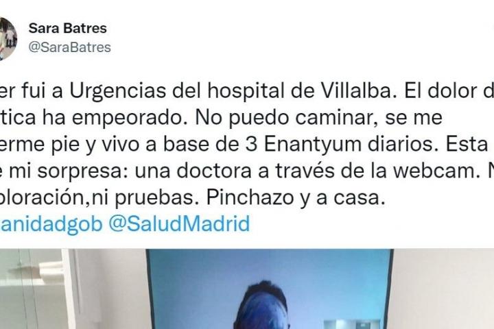 La periodista Sara Batres ha denunciado a través de sus redes sociales lo que le ha ocurrido cuando fue este lunes a las Urgencias del hospital de Villalba (Madrid).
