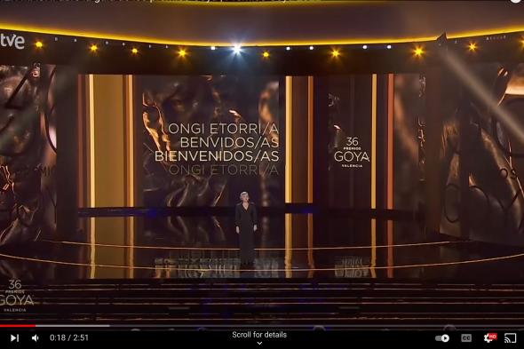 Lo que ha llamado la atención no tiene nada que ver con Carmen Machi y sí con lo que se vio en la pantalla del fondo, donde se daba la bienvenida a los espectadores en gallego —“benvidos/as”—, castellano —“bienvenidos/as”— y euskera –“ongi etorri/a”.
