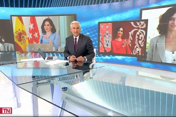 Para hablar del premio a la presidenta, Telemadrid montó un amplio dispositivo que empezó con una introducción en la que se podía ver a Ayuso en todas las pantallas del plató.