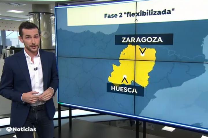 A la hora de hablar de los nuevos brotes de contagio del coronavirus y de las zonas que podrían cambiar de fase, la cadena ha ubicado de forma incorrecta a Zaragoza y a Huesca. Colocando a Zaragoza al norte y a Huesca al sur.
