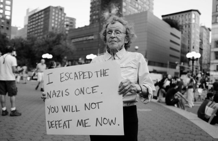 Después de que varios grupos de supremacistas blancos desataran la violencia y causaran la muerte de una persona en Charlottesville, Virginia (EE UU), cientos de personas se congregaron este domingo en ciudades de todo el país para manifestarse en contra del odio organizado. En Nueva York, se vio a una mujer con un impactante cartel que decía: "Escapé de los nazis una vez. No me venceréis ahora".