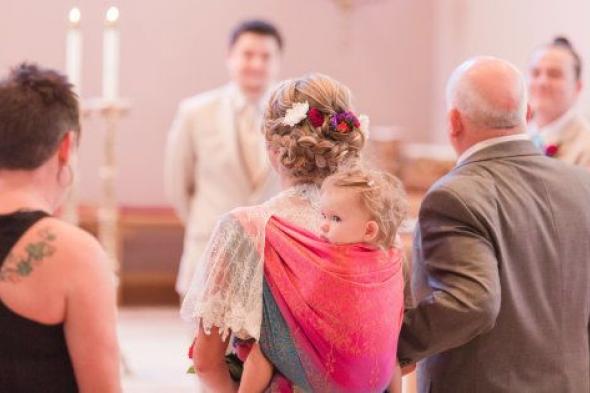 En la boda, que se celebró este verano, Mort llevó en la espalda a su hija Ellora, que aún no había cumplido los dos años, con un portabebés de tipo fular. Cargó con ella hasta el altar y durante toda la ceremonia.
