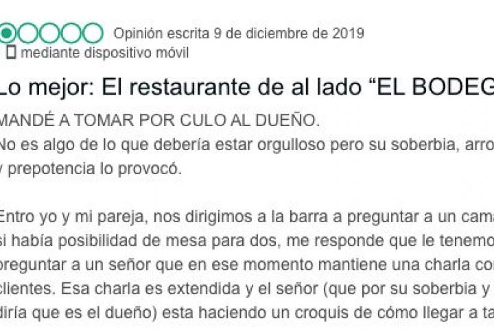 El texto promete desde el título (“Lo mejor: el restaurante de al lado, ‘El Bodegón’) y el subtítulo: “Mandé a tomar por culo al dueño”. En la introducción, el usuario admite que no es algo de lo que debería estar orgulloso, pero subrayara que su “soberbia, arrogancia y prepotencia lo provocó”.