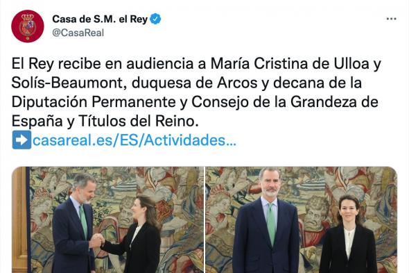 “El Rey recibe en audiencia a María Cristina de Ulloa y Solís-Beaumont, duquesa de Arcos y decana de la Diputación Permanente y Consejo de la Grandeza de España y Títulos del Reino”, se ha podido leer en el tuit con tres fotos del saludo entre ambos.