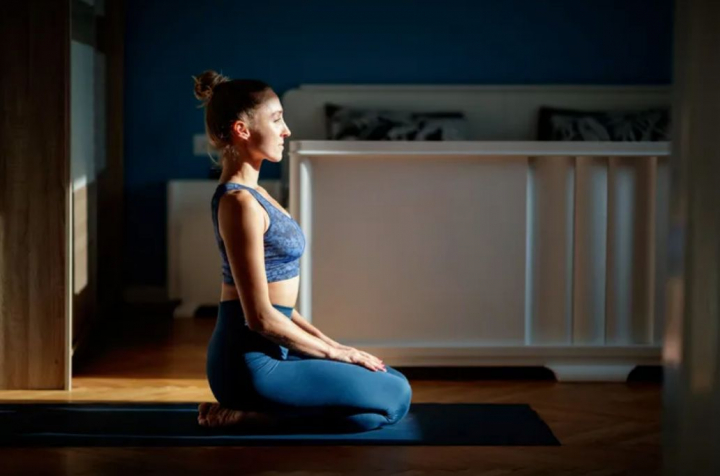 Siéntate sobre los talones, con los dedos de los pies juntos y las rodillas tan abiertas como la medida de la colchoneta. Coloca las manos sobre el vientre para sentirlo: inhala profundamente, inhala por la nariz, exhala por la nariz.