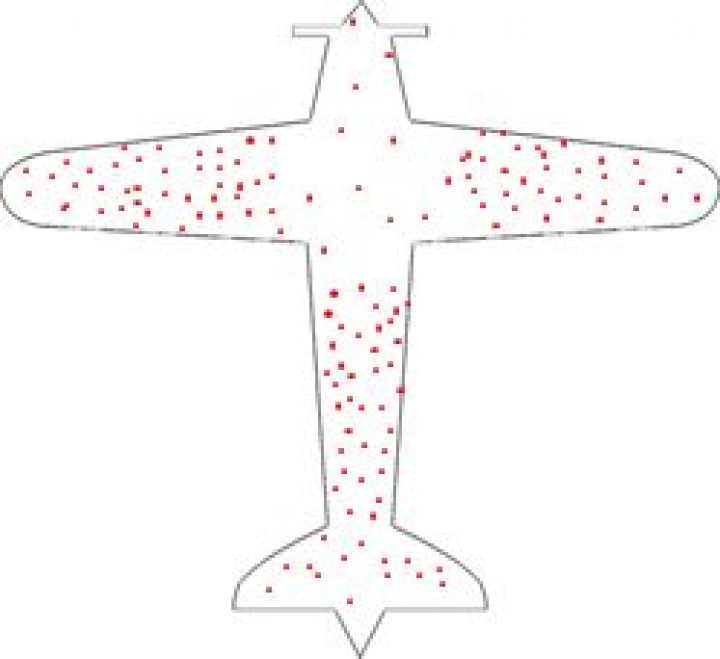 Para intentar averiguarlo se registraba tras cada misión cuántos de los aviones de la escuadrilla habían caído y cuántos habían regresado con o sin daños. Aquellos que volvieron dañados se revisaban para determinar por cuántos proyectiles habían sido alcanzados y en qué parte del avión habían impactado. Para visualizar como se distribuían estos impactos sobre el cuerpo de los aviones, conviene marcar en un mismo avión todos los impactos observados, para obtener algo así como el siguiente gráfico, que muestra el avión desde abajo. (Estamos asumiendo aquí que todos los aviones son del mismo tipo. Si hay varios tipos involucrados cuyas formas difieren sustancialmente, puede repetirse este ejercicio para cada tipo por separado.)