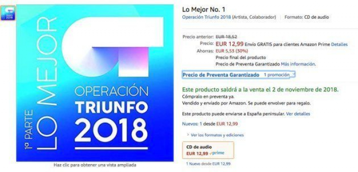 Captura de la página de Amazon en la que se podrá comprar el primer álbum recopilatorio de las canciones del programa 'Operación Triunfo 2018'.Amazon