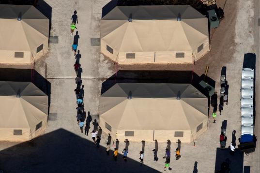 Un grupo de inmigrantes recién detenidos en la frontera de México son conducidos entre las tiendas de campaña del centro de detención, en Texas.