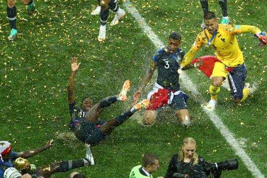 Los jugadores de la Selección de Francia Ousmame Dembele, Presnel Kimpembe y Alphonse Aerola celebran su victoria en la Copa del Mundo 2018 en Moscú.