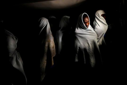 Un migrante que forma parte de un grupo interceptado en el Mediterráneo, descansa después de llegar en un bote de rescate en el puerto de Motril (Granada).