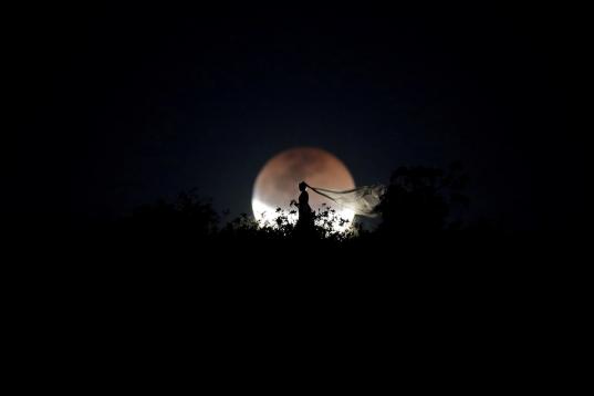 Una novia posa para una foto durante un eclipse lunar total en Brasilia, Brasil.