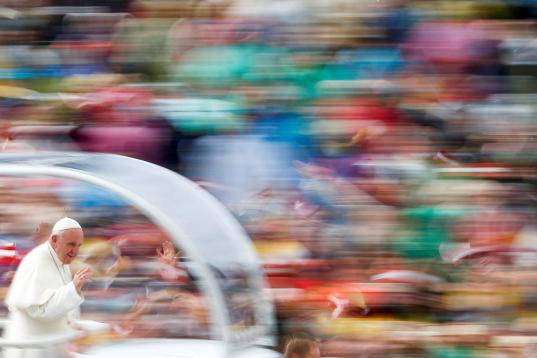 El papa Francisco llega a la Basílica de Aglona, Letonia, en su papamóvil, mientras saluda a la gente.