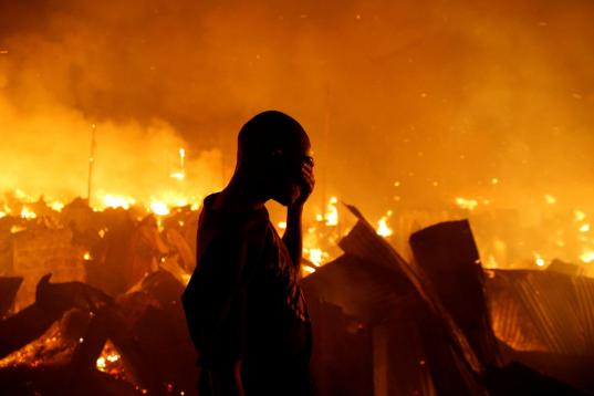 Un residente del barrio Kijiji de Nairobi no puede mirar cómo las casas de sus alrededores se queman durante un incendio.