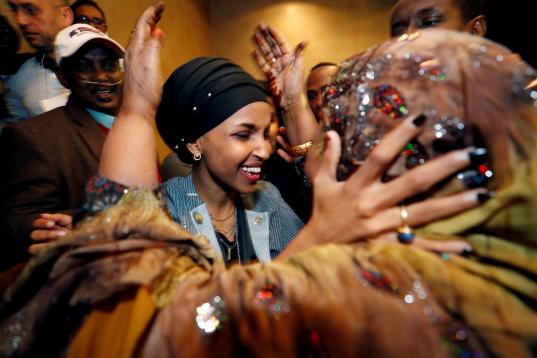 Ilhan Omar es abrazada por su suegra después de ganar su escaño de congresista en las elecciones 'midterm' en Minneapolis, Minnesota. Es la primera musulmana en lograr el puesto.