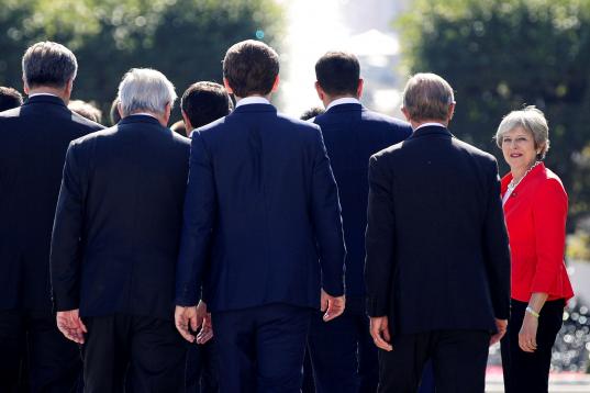 La primera ministra Británica, Theresa May se suma al grupo de líderes para la foto de familia en la reunión de Unión Europea en Salzburgo, Austria.