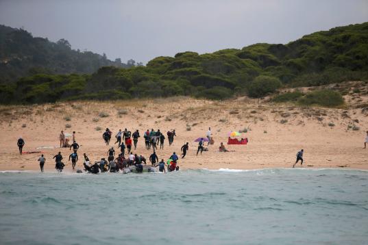 Un grupo de migrantes desembarca en la playa del Cañuelo (Tarifa), llena de veraneantes, después de cruzar el estrecho de Gibraltar en bote.