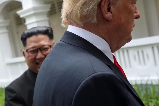 El presidente de Estados Unidos, Donald Trump, y el líder de Corea del Norte, Kim Jong Un, caminan juntos antes de su almuerzo de trabajo durante su cumbre en el Hotel Capella, en Singapur.