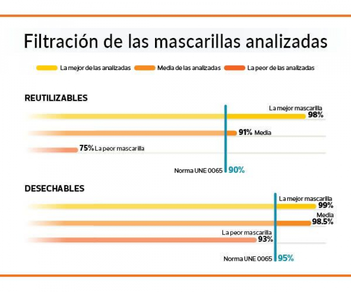 El estudio mide mascarillas higiénicas y quirúrgicas, desechables y reutilizables, y tanto para niños como para adultos. Entre los modelos analizados se comprueba la alta eficacia de filtración de las desechables a la venta en supermercados y grandes superficies, con un 98%. En el caso de las higiénicas reutilizables de tela el porcentaje baja levemente aunque ronda el 90%.