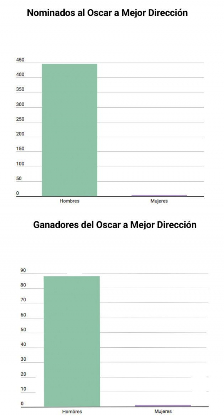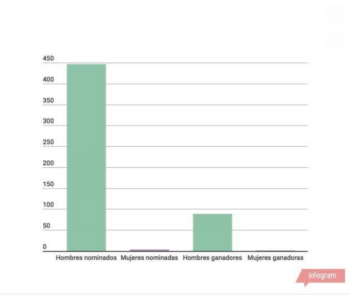 446 hombres nominados frente a 4 mujeres / 88 hombres ganadores frente a una ganadora