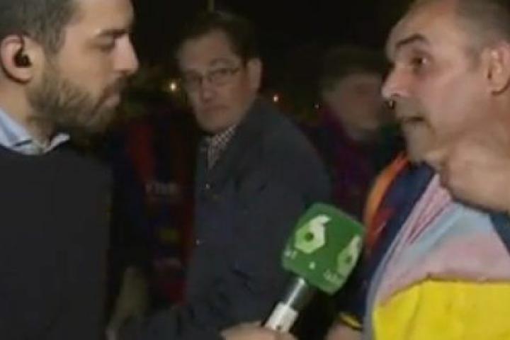 El periodista Marco Aracama entrevistó en directo a Isidoro, un aficionado gallego del Barcelona que contó cómo había conseguido acceder al estadio con una camiseta amarilla debajo, cuando otros aficionados habían visto cómo la Policía se las requisaba.