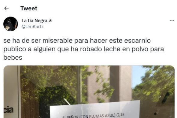 “Se ha de ser miserable para hacer este escarnio publico a alguien que ha robado leche en polvo para bebes”, ha escrito @UruKurtz, cuyo mensaje acumula en dos días más de 1.500 retuits y 10.800 ‘me gusta’.