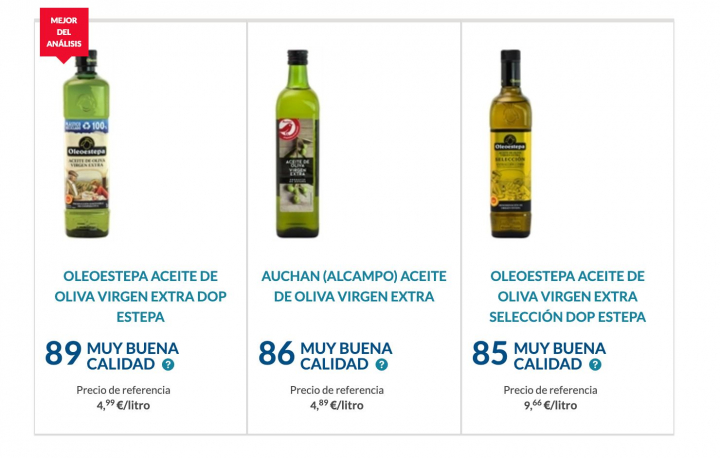 La organización de consumidores ha analizado 39 de estos productos y ha determinado que dos de ellos —Borges y Olivar de Segura—no son realmente virgen extra, son “simplemente virgen”. Tras el estudio han concluido que “los consumidores españoles tienen hoy en en supermercado productos de mejor calidad que hace unos años”.