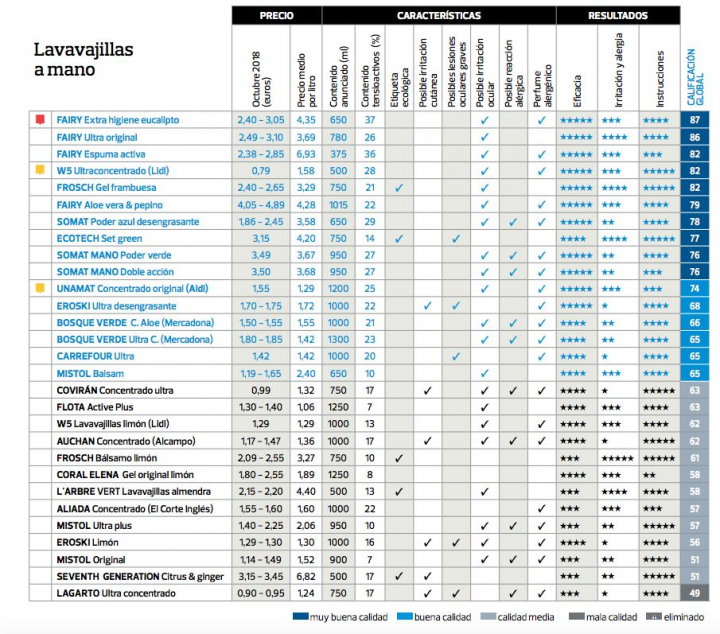 El detergente mejor valorado en este análisis de la OCU es el Fairy Extra Higiene Eucalipto, que repite posición respecto al año pasado. Este lavavajillas líquido concentrado para lavar a mano se vende en una botella de plástico con capacidad de 650 mililitros. Lo fabrica y comercializa la empresa estadounidense Procter & Gamble. Obtiene una calificación de 87 puntos de los 100 posibles.