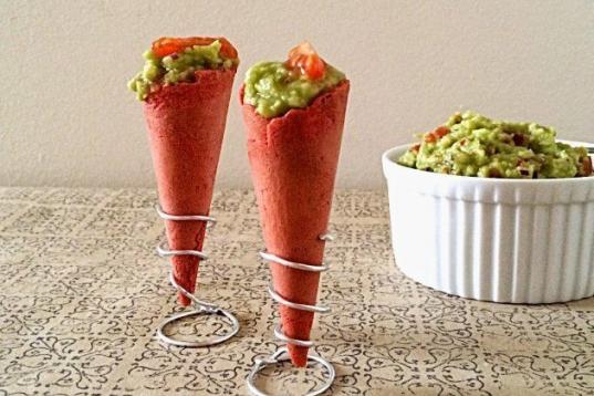 Ingredientes: cucuruchos de tomate, aguacate, tomates maduros, cebolla roja, pimienta negra, sal, zumo de limón, aceite de oliva virgen y semillas de tomate para decorar.