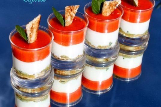 Ingredientes: pan de molde, albahaca fresca, ajo, piñones, queso rallado, aceite de oliva virgen, rulo de cabra, queso crema, nata líquida, tomates maduros, azúcar, sal, aceite de oliva virgen y gelatina neutra.
