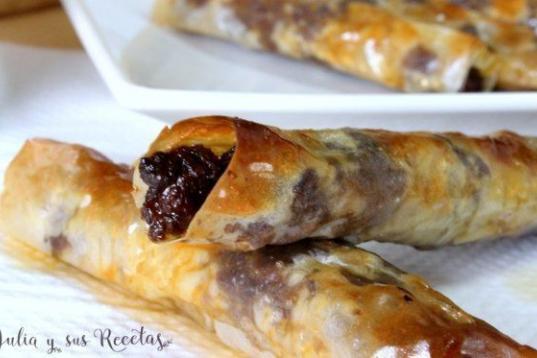 Ingredientes: morcilla de cebolla, manzana, azúcar moreno, piñones, aceite de oliva, pasta brick y huevo.