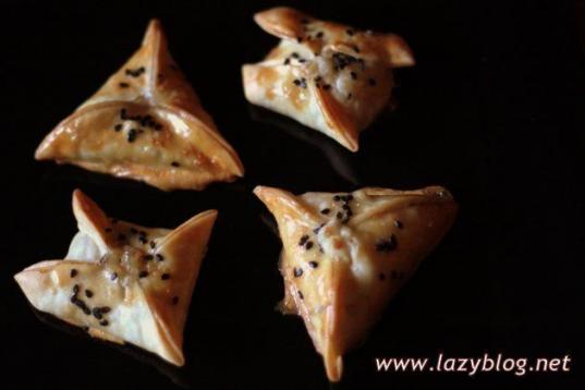 Ingredientes: masa para empanadillas, cebolla caramelizada, queso de cabra, un huevo, 1 huevo, semillas de sésamo negro o blanco.