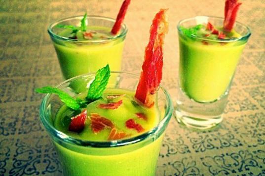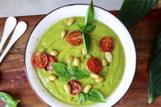 Ingredientes: aguacates maduros, melón, cebolla, jengibre fresco, hojas de menta, albahaca fresca, sal, aceite de oliva virgen extra, zumo de media lima, espinacas frescas y agua.