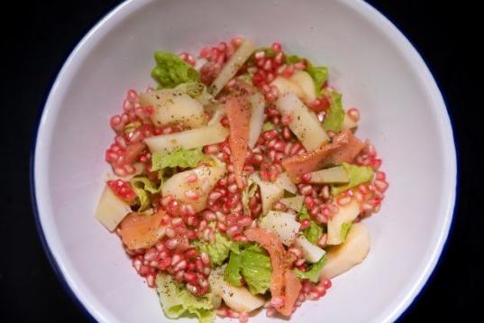 Ingredientes: unas hojas de lechuga, una pera o dos, media granada, una cuñita de queso manchego curado o semicurado, un par de lonchas de salmón ahumado o marinado y aceite de oliva, sal, vinagre, mostaza y miel. Opcional: za...