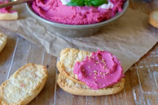 ngredientes: garbanzos cocidos, remolacha cocida, sal, comino molido, aceite de oliva virgen extra, tahini, crema de queso y zumo de limón.