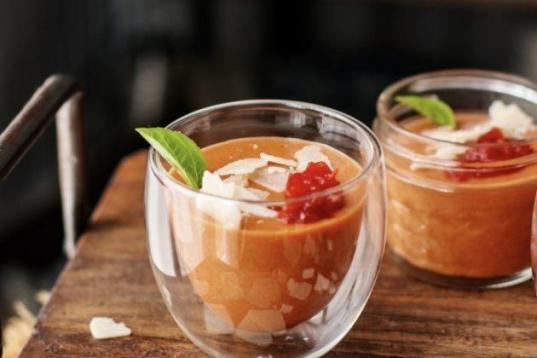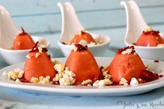 Ingredientes: tomates maduros, un diente de ajo, pimiento rojo, pan duro, sal, vinagre, aceite de oliva, gelatina neutra, jamón serrano y huevos cocidos.