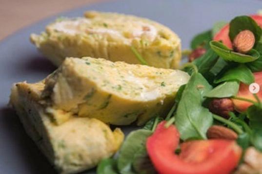 Ingredientes: huevos, calabacín, queso mozzarella en lonchas, queso mozzarella fresco, filetes de pollo muy finos (o jamón cocido), sal y pimienta blanca.