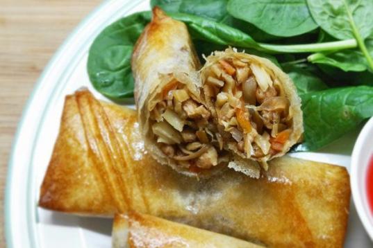 Ingredientes: cebolla, zanahoria grande, champiñones, soja texturizada, col, vinagre de arroz, salsa de soja, jengibre en polvo, masa brick, sal, pimienta y aceite de oliva
