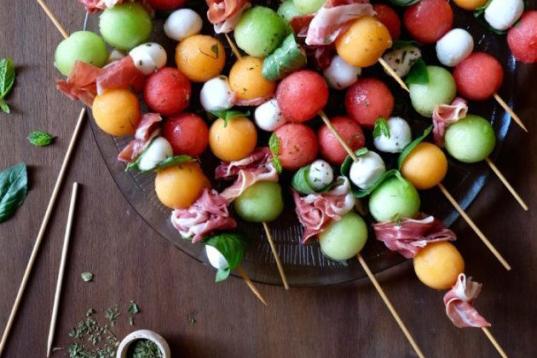 Ingredientes: melón cantaloupe, melón gala, sandía, mozarella fresca, albahaca fresca, jamón ibérico, aceite de oliva virgen extra, albahaca seca y salsa pesto.