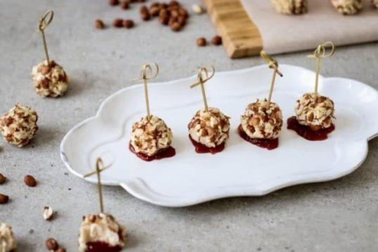 Ingredientes: queso crema, queso curado de oveja, cacahuetes y mermelada de fresa.