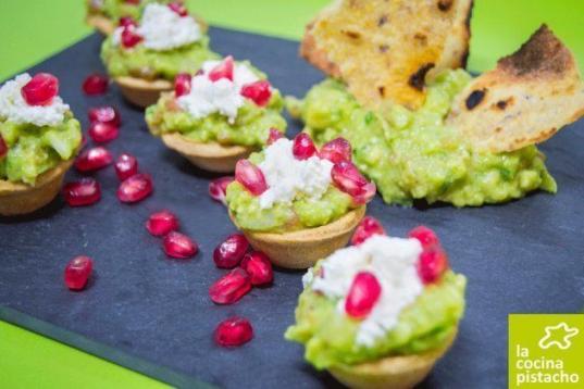 Ingredientes: aguacates, tomates, cebolleta, ajo, 1/2 lima, guindilla, cilantro, requesón, granada, aceite de oliva, tortillitas de palomitas, polvo de palomitas, harina y agua tibia.