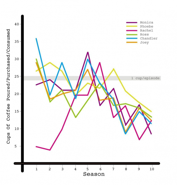 De hecho, el grupo de amigos consume tanta cafeína a lo largo de las diez temporadas que un espectador intrépido decidió documentarlo.