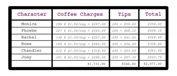 En la tabla se muestra lo que gasta cada personaje en café (con el precio del café y las propinas desglosadas y la cantidad total).