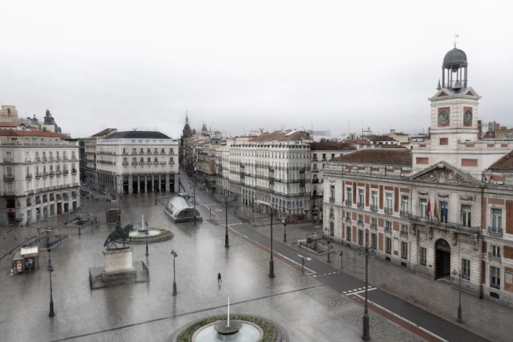La favorita del público es la fotografía de la Puerta del Sol. "Era un día nublado y transmite mucha melancolía, un buen ejemplo de foto que invita a quedarse en casa. Pero la gente fliparía si viese las originales. Estaba todo lleno de coches, de gente. Estuve a punto de dejar a uno de los que se disfrazan, pero me pareció demasiado cómico", explica. Fue de las pocas localizaciones en que tuvo problemas: estaba en la terraza de El Corte Inglés de Preciados y le echaron en cuanto lo vieron haciendo fotos.