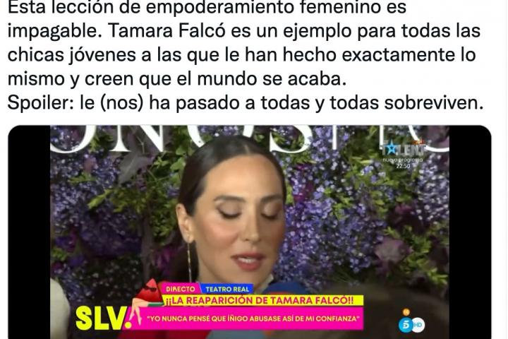 Este fragmento de dos minutos de Tamara Falcó ha despertado una oleada de aplausos en Twitter. “Esta lección de empoderamiento femenino es impagable. Tamara Falcó es un ejemplo para todas las chicas jóvenes a las que le han hecho exactamente lo mismo y creen que el mundo se acaba. Spoiler: le (nos) ha pasado a todas y todas sobreviven”, ha escrito la usuaria Pilar RL.