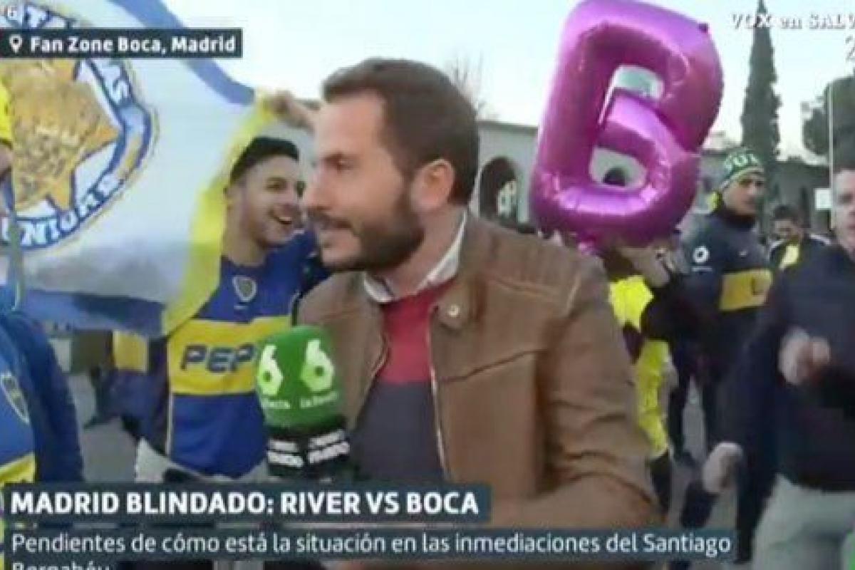 El periodista de La Sexta Antonio Campos acudió este domingo al Paseo de la Castellana de Madrid para cubrir la información de la 'fan zone' de Boca Juniors, que perdió la final de la Copa Libertadores frente al River Plate en el estadio Santiago Bernabéu.