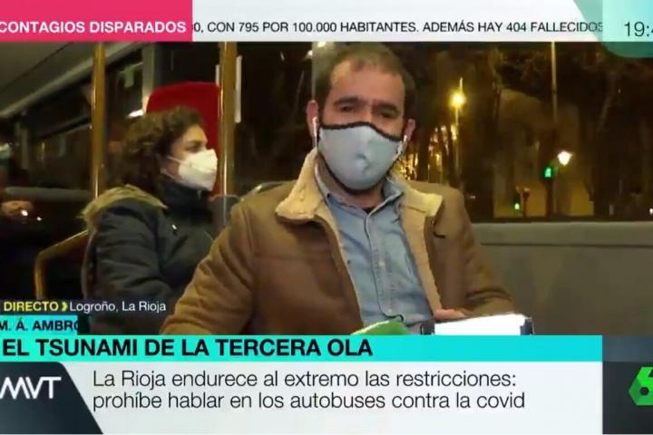 El periodista Miguel Ángel Ambrosio se subió a un autobús municipal de Logroño. Como no se puede hablar, emitió un video desde el móvil que se había grabado previamente explicando la nueva medida.