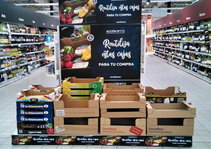 La cadena ha empezado a ofrecer a los clientes cajas de cartón vacías para que metan los productos comprados, en vez de las tradicionales bolsas de plástico. Se trata de los mismos envases que utilizan los proveedores para llevar fruta u otros productos a la tienda, que ahora pueden tener un segundo uso por parte de los consumidores.