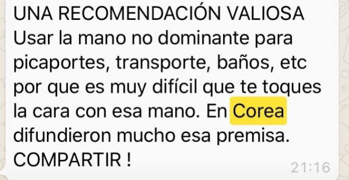 Si eres zurdo, lo que tienes que hacer es abrir la puerta con la derecha. Y si eres diestro, con la izquierda. “Es muy difícil que te toques la cara con la mano no dominante”, dice el mensaje.