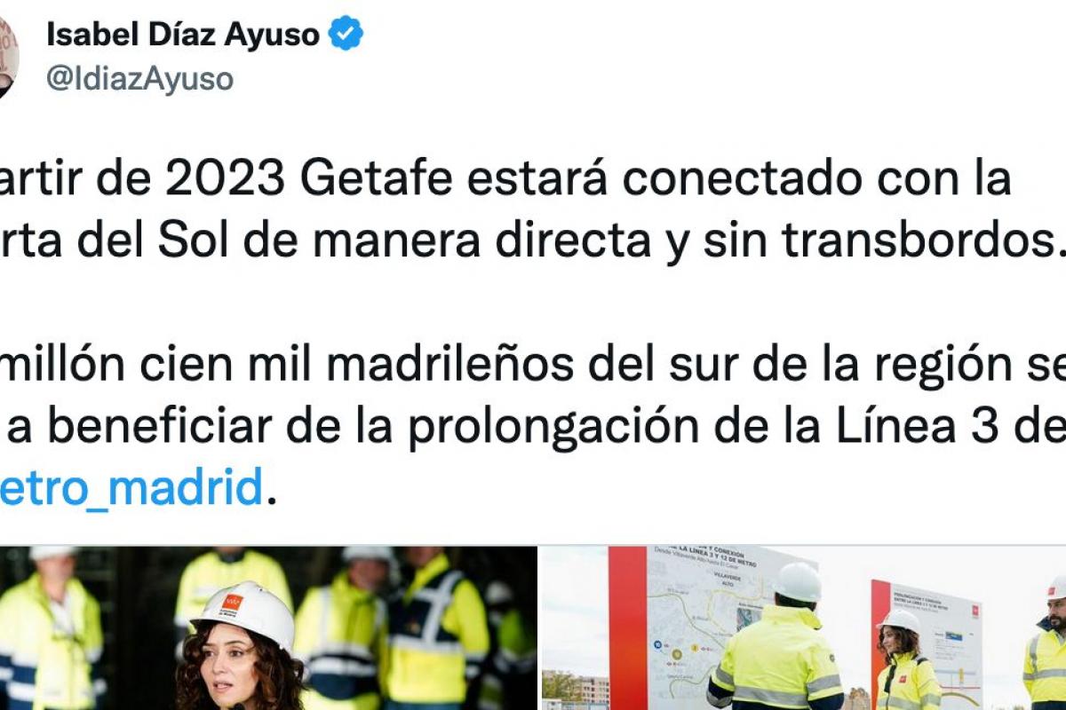 En su perfil de Twitter, Ayuso remarcó que “a partir de 2023 Getafe estará conectado con la Puerta del Sol de manera directa y sin transbordos” e incidió que un millón cien mil madrileños del sur de la Comunidad se van a beneficiar de la prolongación de la Línea 3.