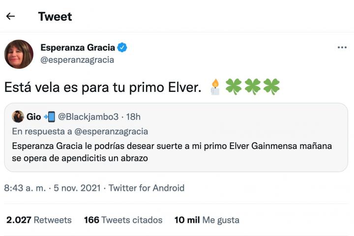 “Esperanza Gracia le podrías desear suerte a mi primo Elver Gainmensa mañana se opera de apendicitis un abrazo”, le ha dicho un usuario de Twitter a la televisiva.